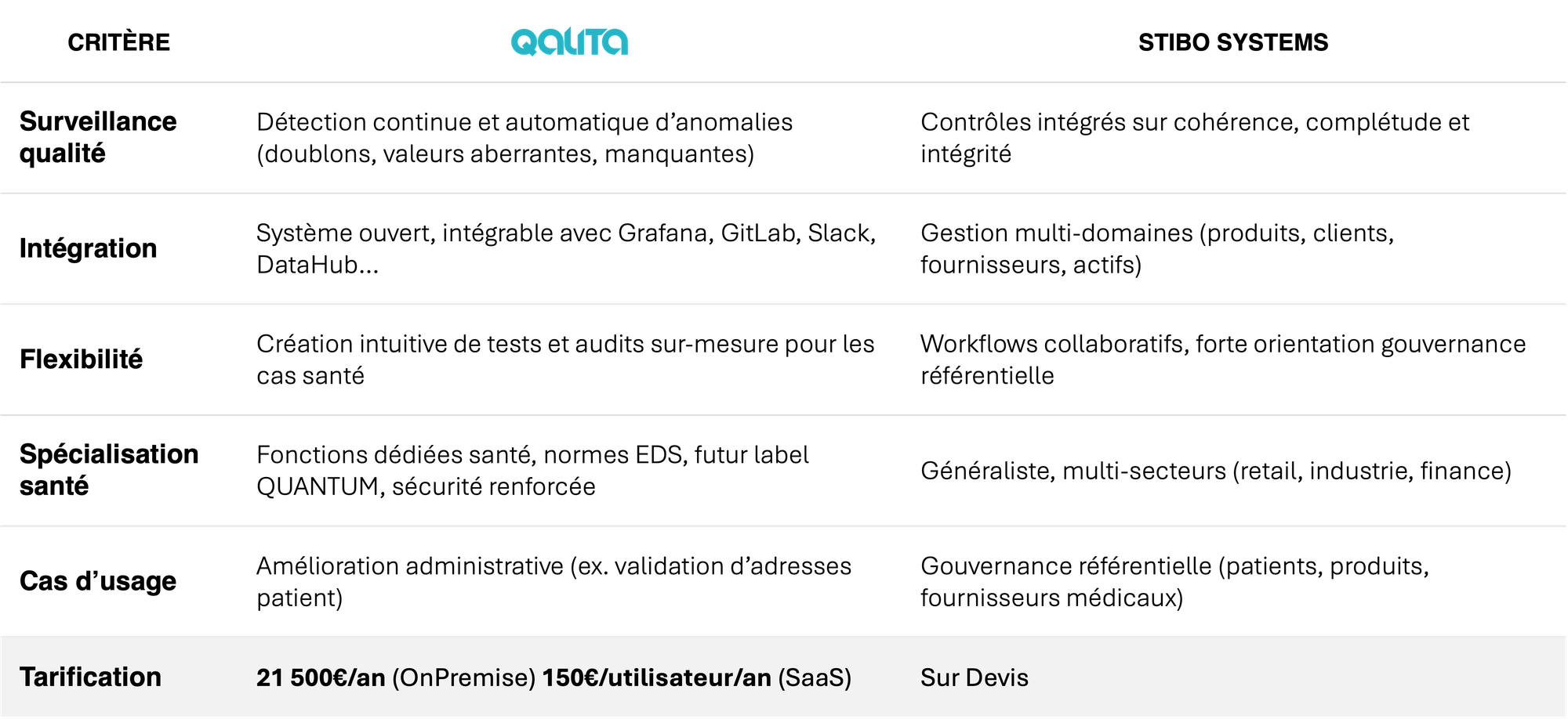 Dans un contexte où la fiabilité des données patients et la réussite des projets IA sont prioritaires, QALITA représente l’alternative pragmatique et spécialisée à des solutions globales mais plus lourdes comme Stibo Systems.